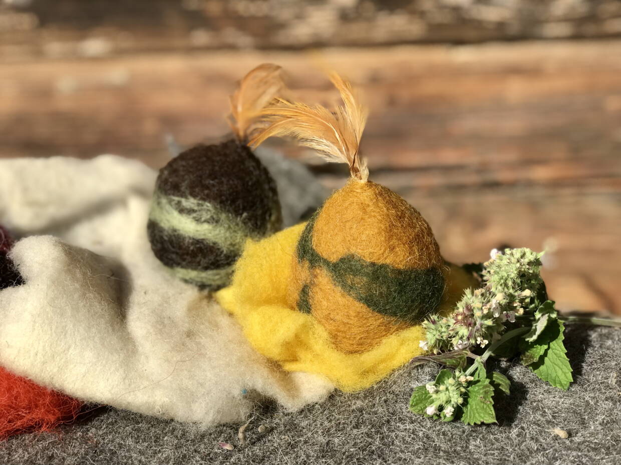 mit eingefilzter Kugel aus Katzenminze und Feder, die den Jagd- und Spieltrieb so richtig anfeuern, um dann tief zu entspannen