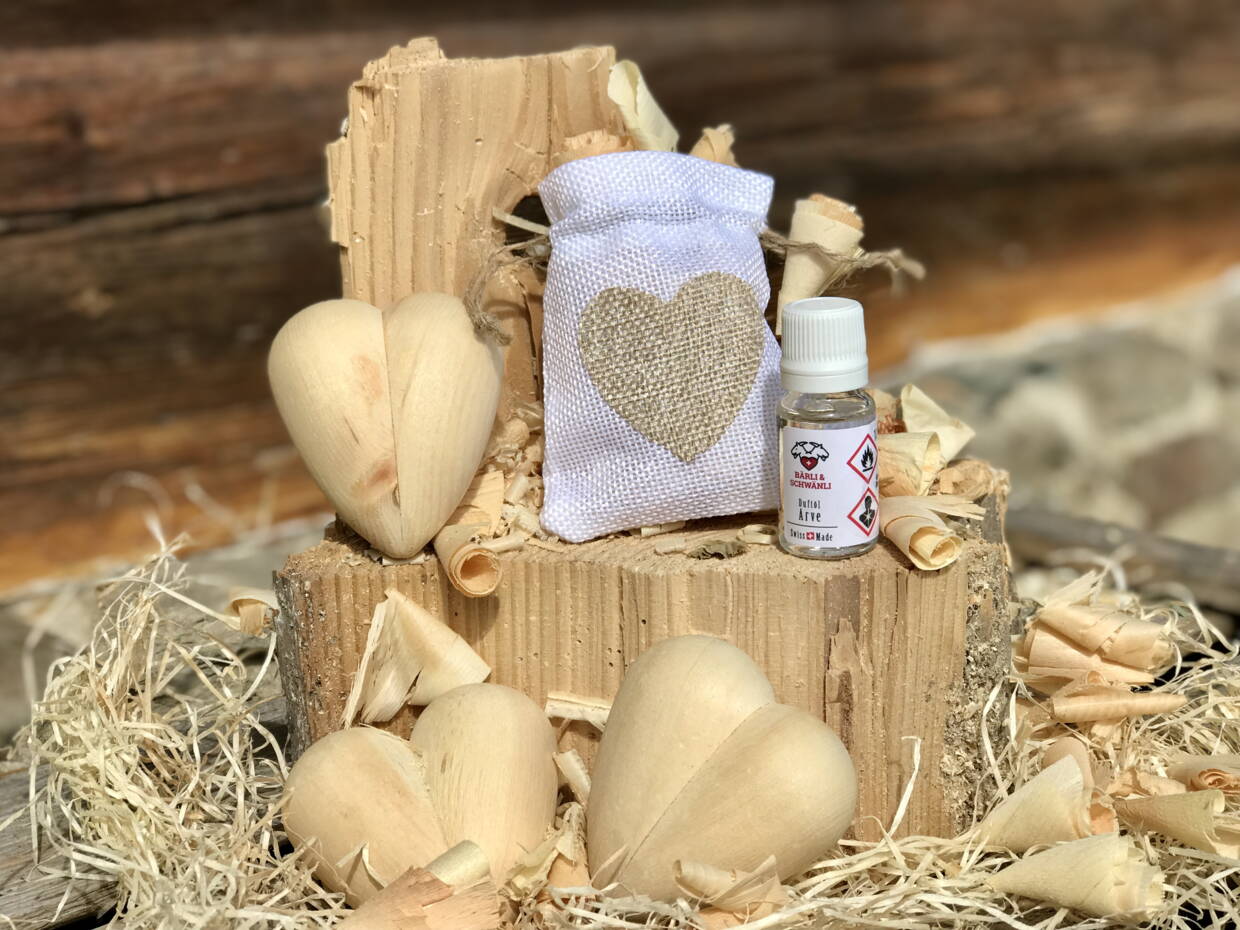 Set: handgedrechseltes Herz aus Graubündner Arve, äth. Bio Arven Duftöl, Arvenspäne, Säckli mit Herzli