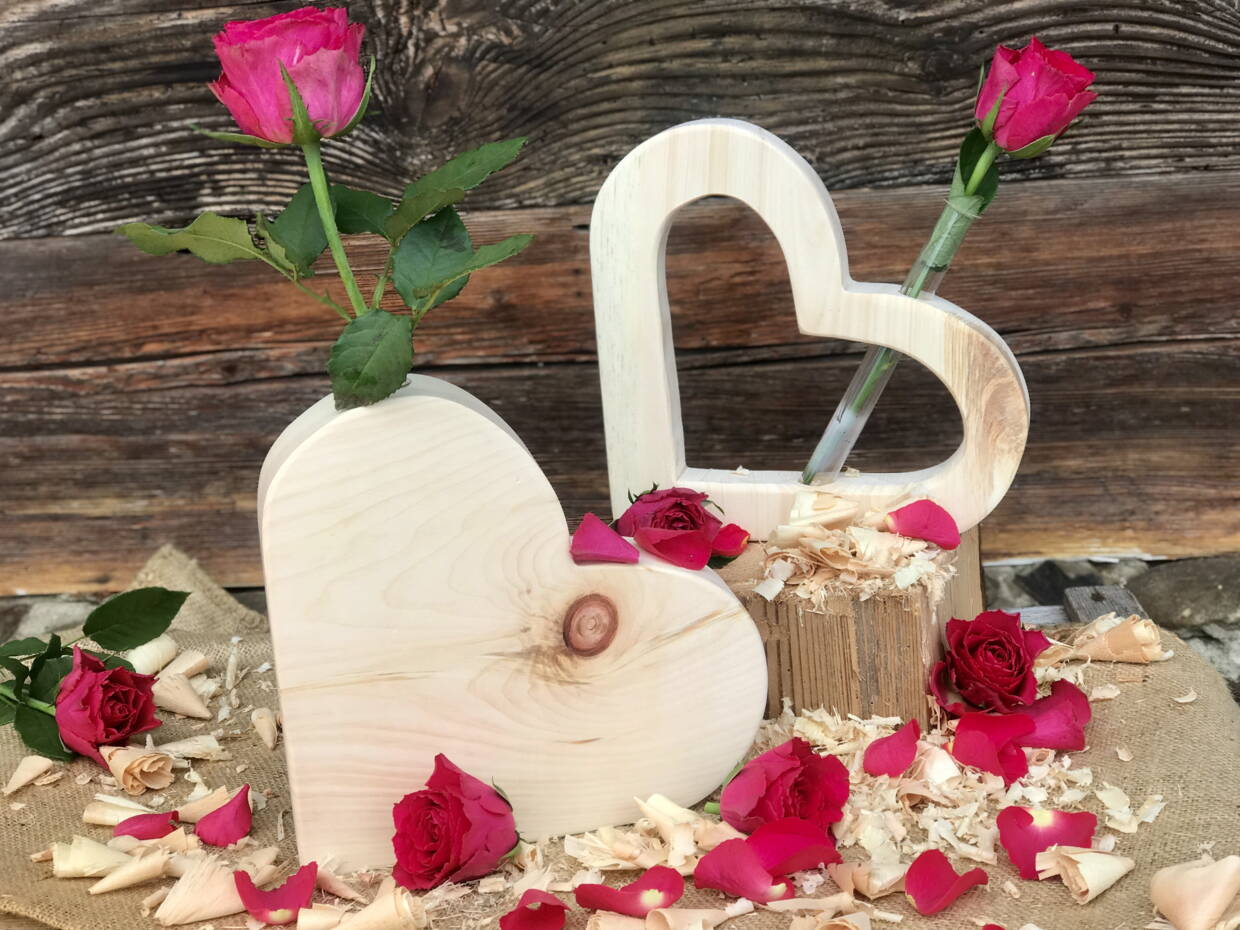Das massive Arvenholzherz mit integriertem, unsichtbaren Väsli für eine Blüte, zeigt genau die richtige Wirkung auf einem Tablett mit dem Kaffee ans Bett oder per Post an einen lieben Menschen verschickt.