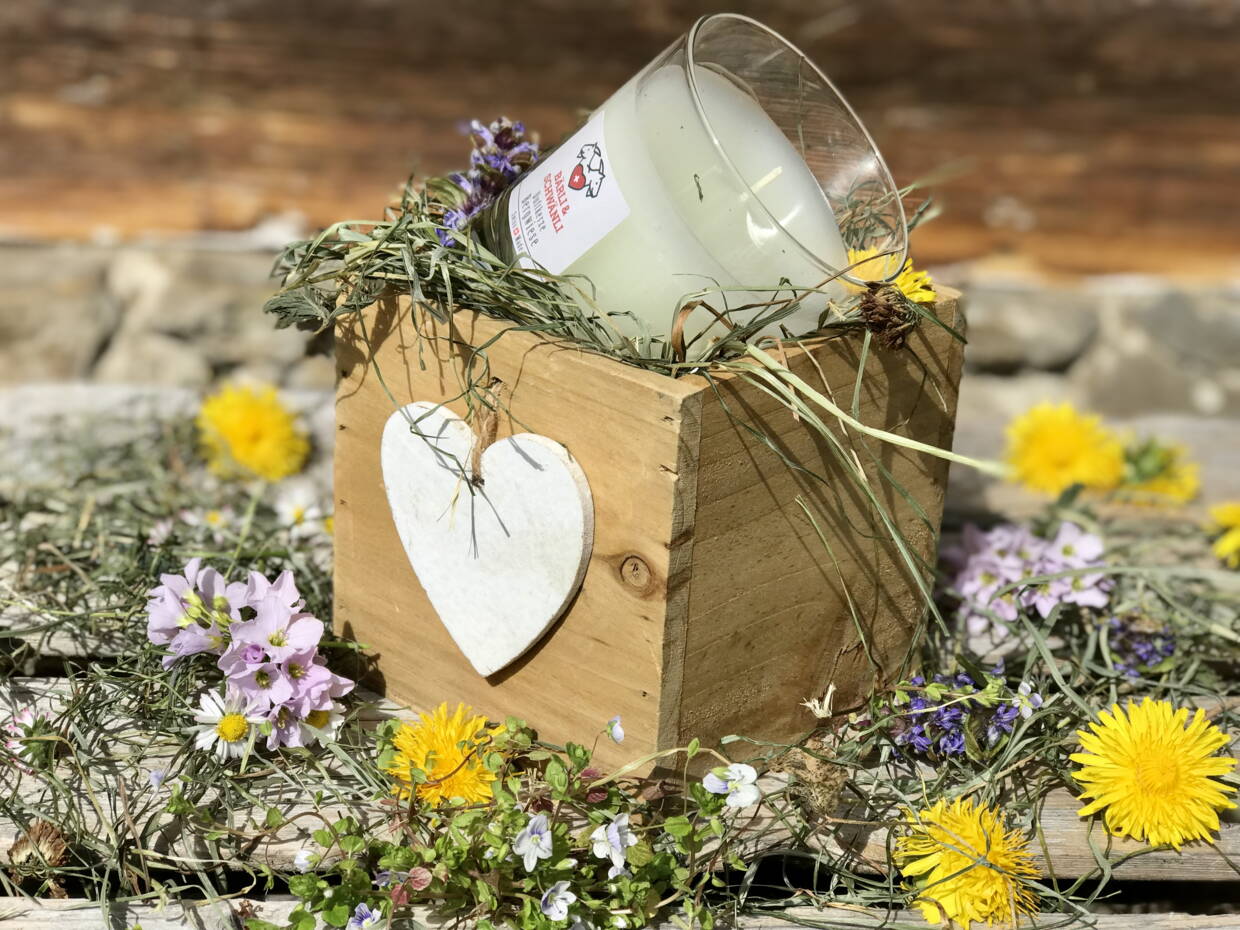 Unsere feine 190g Bergwiesen Duftkerze im Glas, wartet bereits in einer kleinen, mit Bergwiesenheu ausgekleideten Holzschublade mit Holzherz darauf, ihren frühlingshaften Duft zu verbreiten.