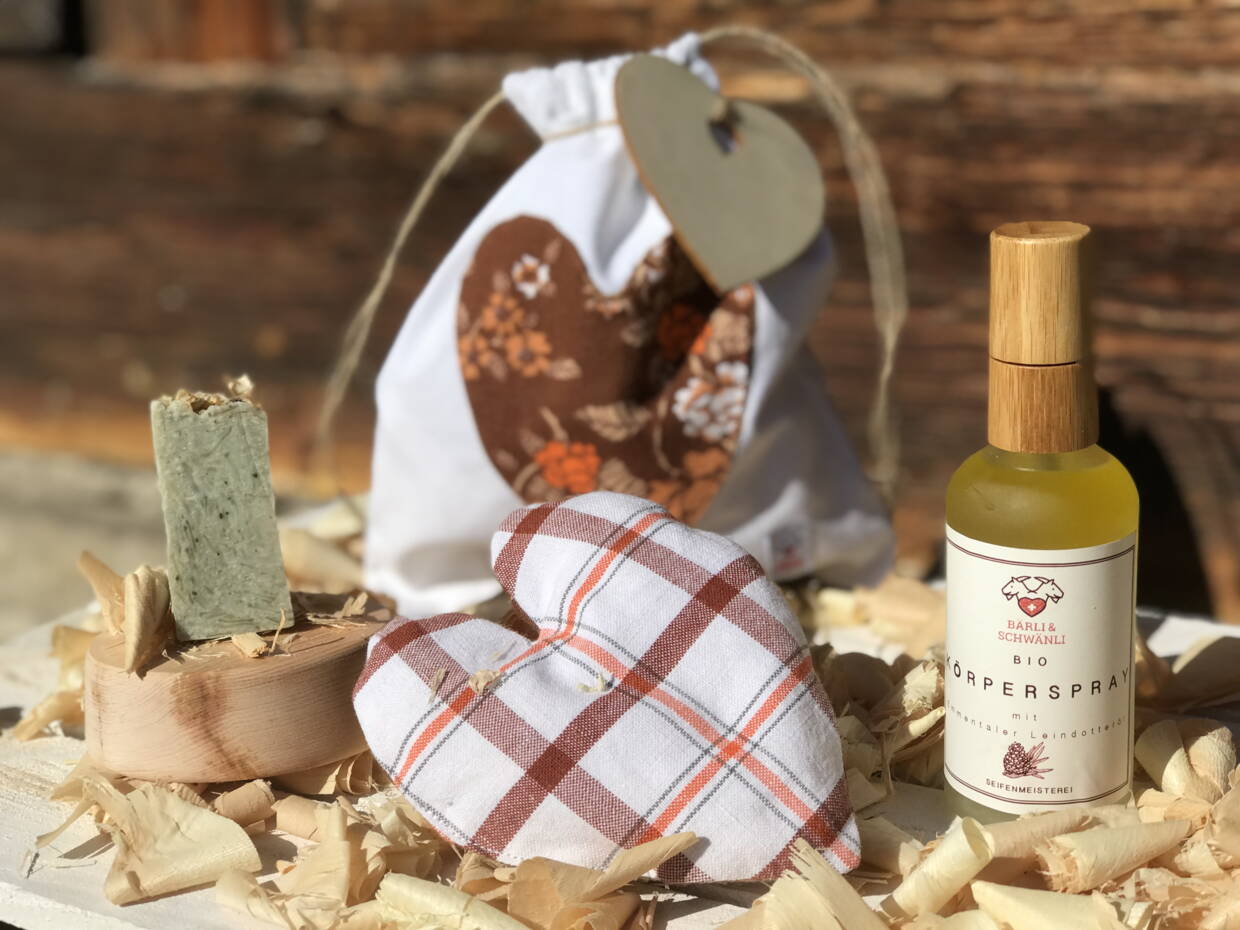 Im Set haben wir ein pflegendes Bio ARven-Körperspray mit Emmentaler Leindotteröl, eine kleine, fein duftende Bio Arvenseife, ein aromatisches Entspannungsherzli, gefüllt mit herrlich duftenden Arvenholzspänen aus der Schweiz - die durch die enthaltenen, ätherischen Öle tief entspannen lassen - zusammengestellt.