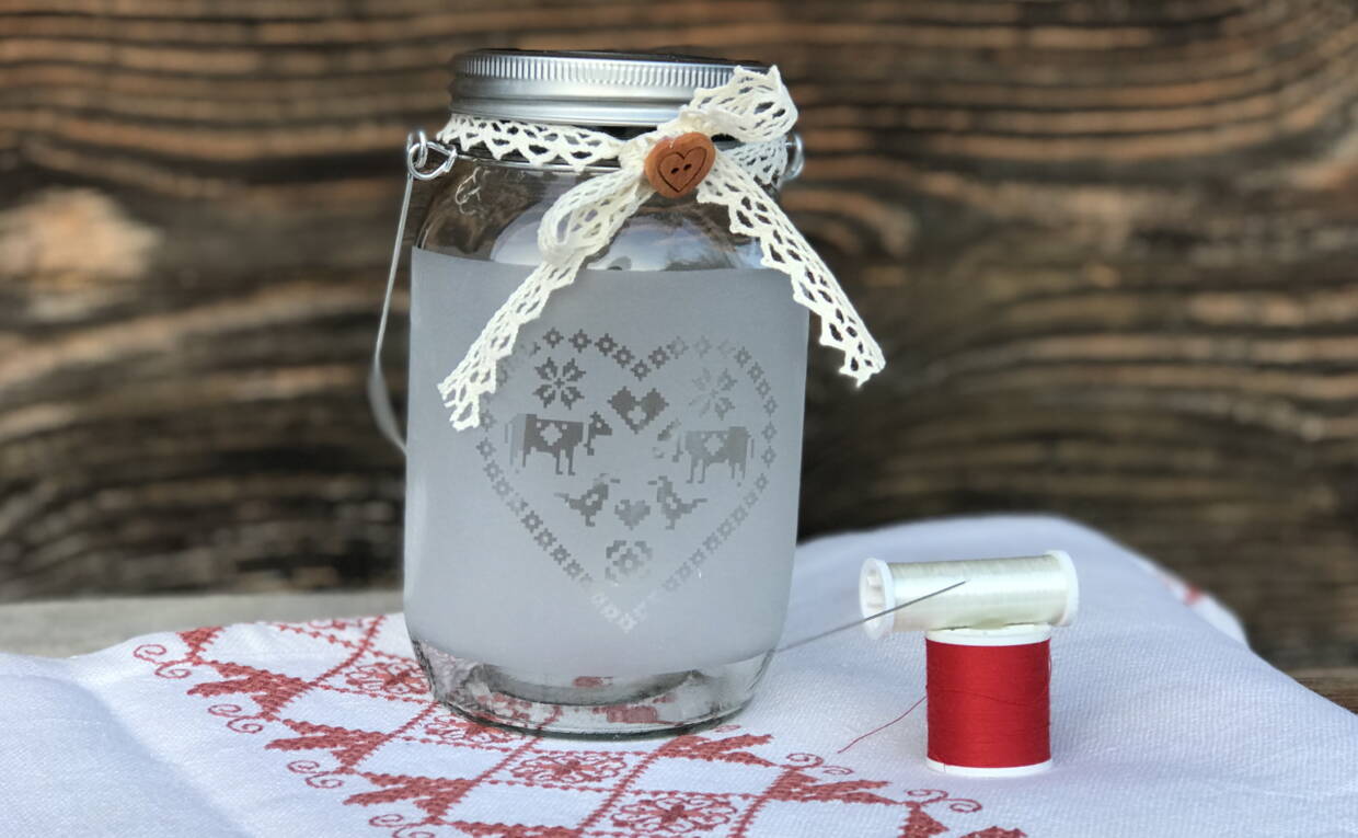 Einmachglas mit Solardeckel mit Herz im gestickten Kreuzstich-Look