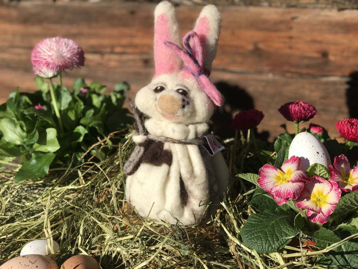 Aber sie sehen nicht nur herzig aus unsere wollweissen Häsli mit ihrem rosa-violetten Mäscheli am Ohr. Hier verbinden sich kuscheliges Filzhandwerk mit duftendem Schweizer Berglavendel, damit grosse und kleine Osterhäsinnen am Bettli gut behütet werden und durch den entspannenden Duft des Lavendels beruhigt einschlafen können.