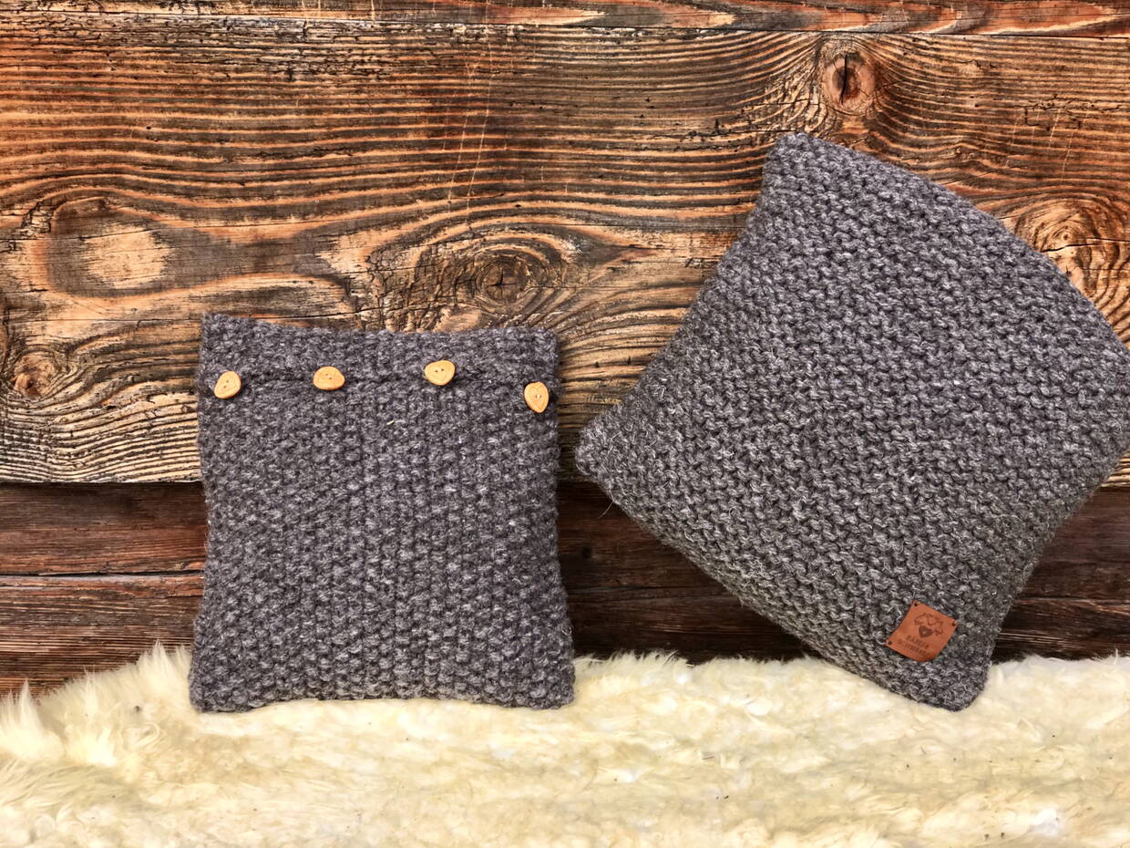 Handgestrickt mit Natur grau/brauner Schweizer Schafs-Wolle, sind diese Kissen ein kuscheliges Accessoire für jede Couch, Sessel, Gartenstuhl oder Bett.