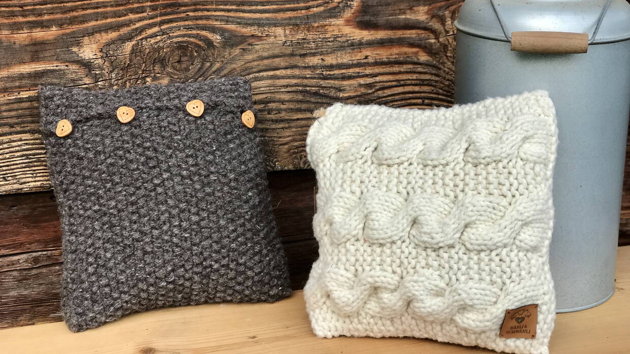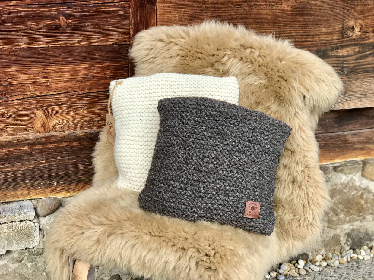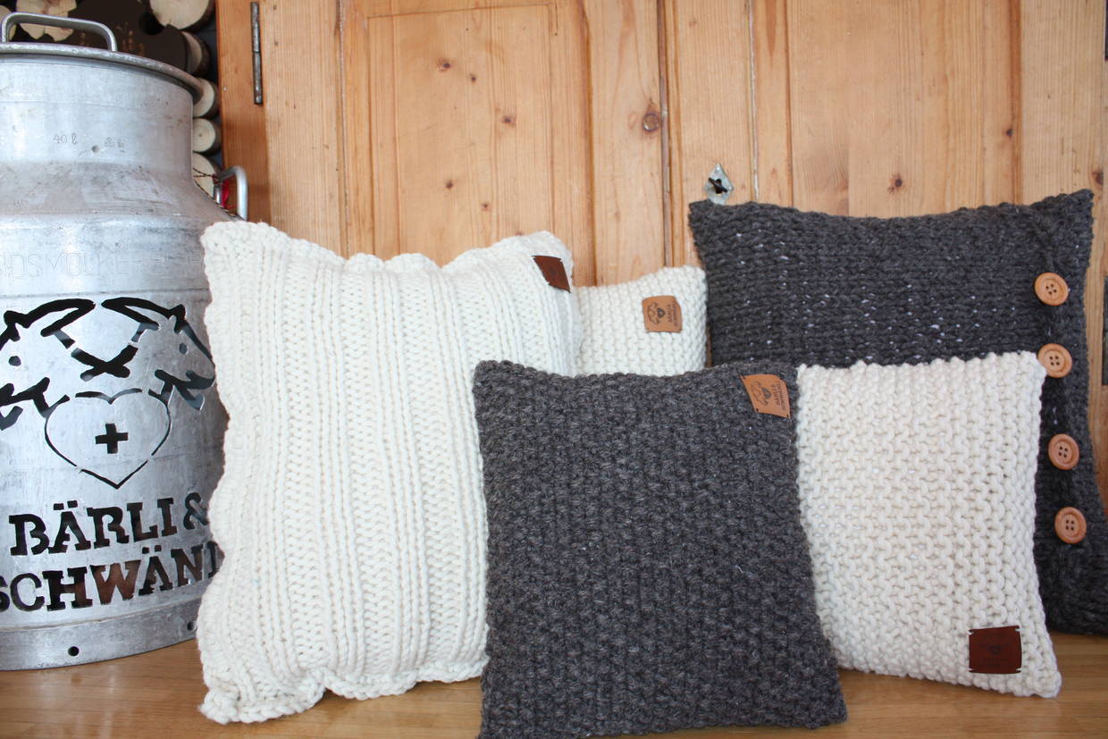 Handgestrickt mit natürlicher wollweisser oder grau/brauner Schweizer Schafs-Wolle, sind diese Kissen ein kuscheliges Accessoire für jede Couch, Sessel, Gartenstuhl oder Bett.